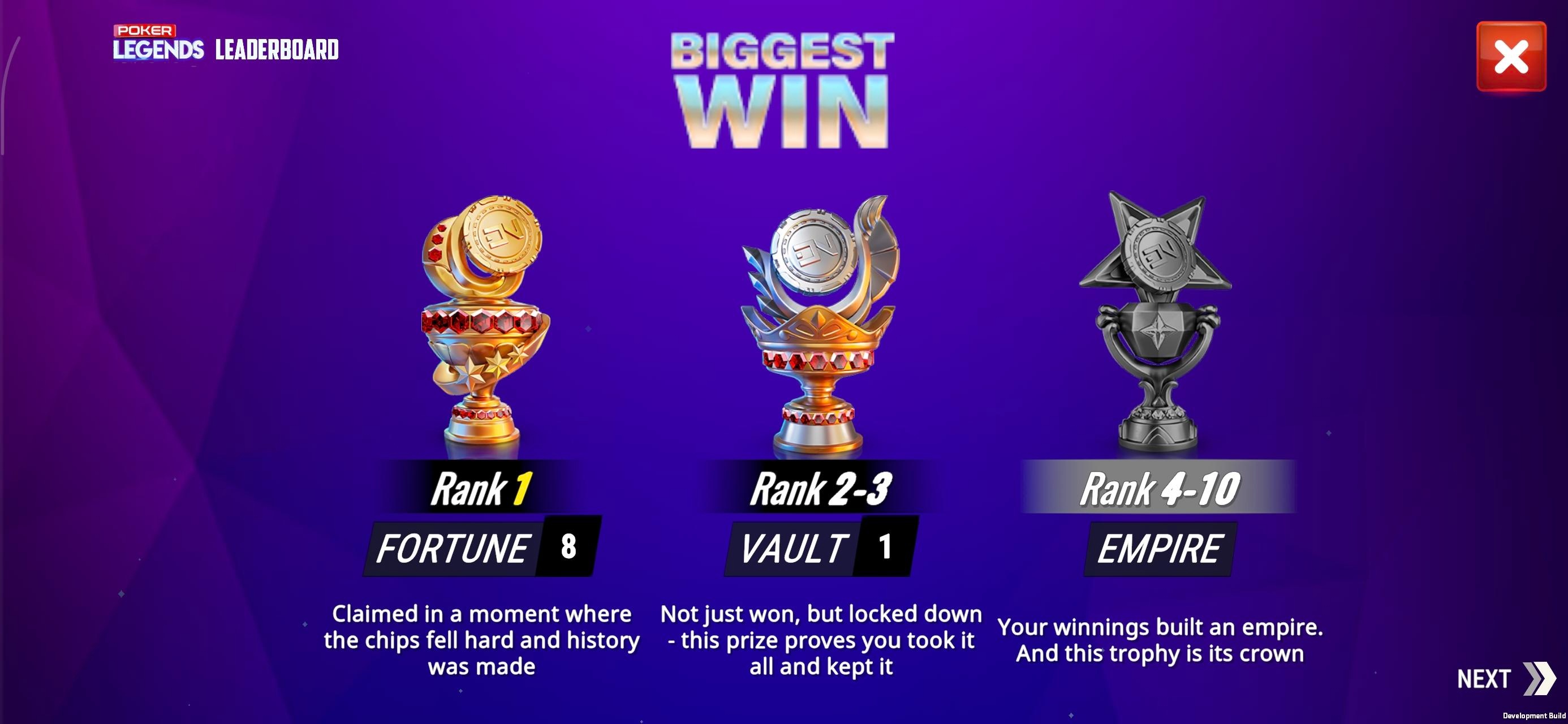 Poker Legends rewards excellence with rings and trophies. Weekly tournaments grant rings for Top 10 finishers, with unique designs for champions. Seasonal trophies are awarded at the end of competitive seasons, marking long-term achievements.